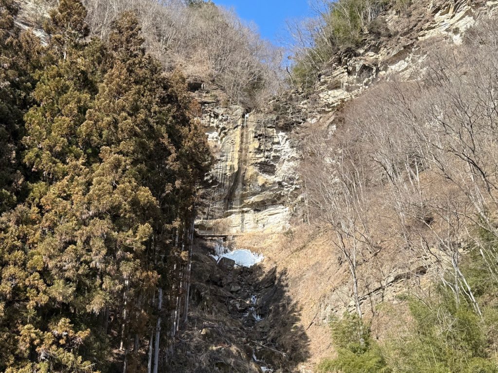 駐車場から遠目に滝を見る事ができ、滝壺の辺りに氷瀑ができているのが見えました。