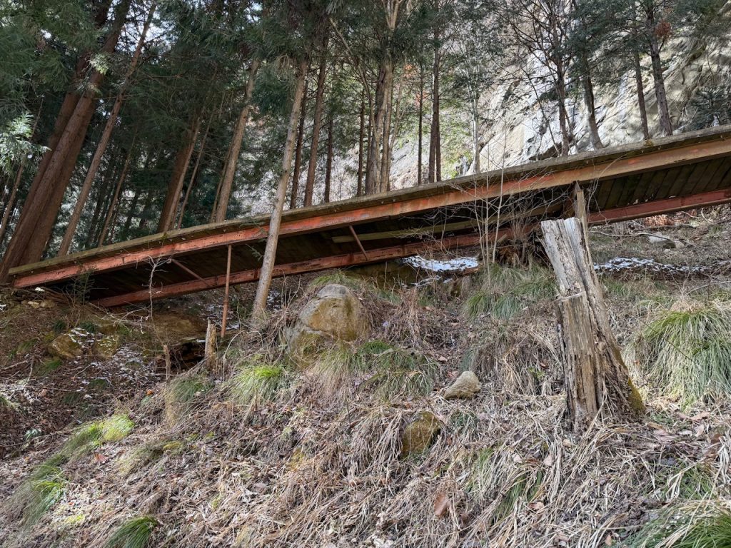 滝を裏見できる遊歩道は少し傾いており、通行するのは危ない感じです。