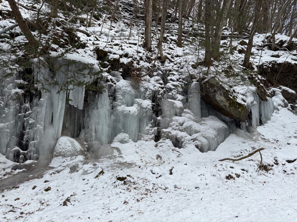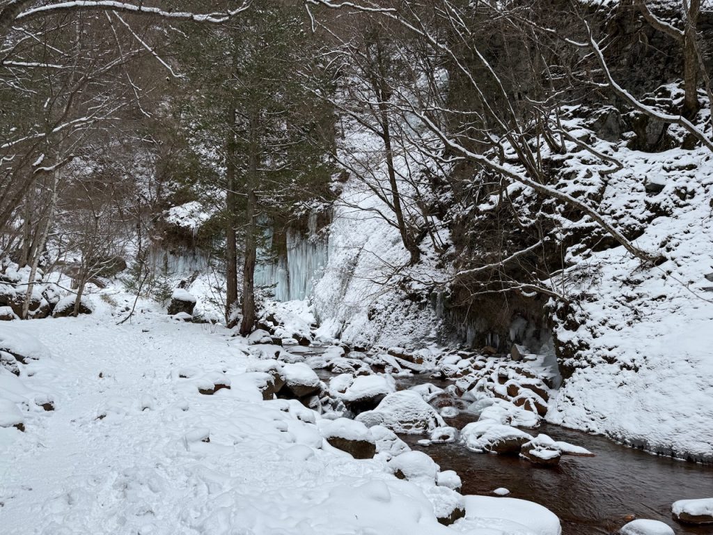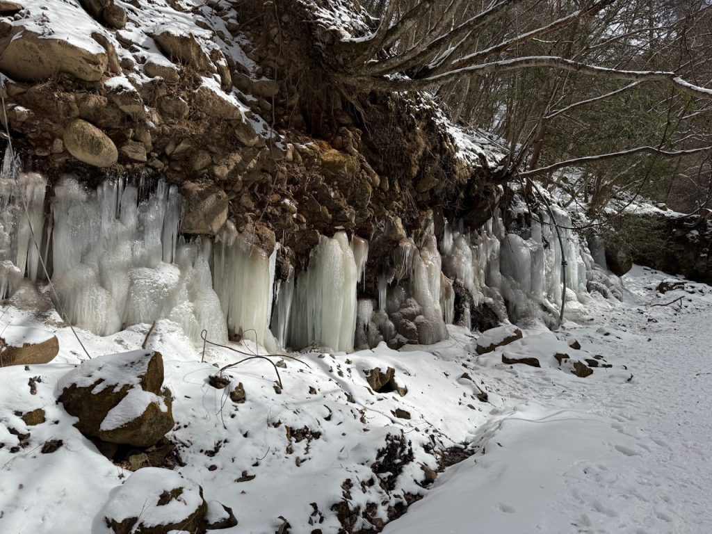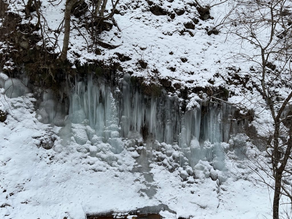 遊歩道を歩いていると渓谷の両サイドの岩壁にちょこちょこと氷柱が群生しているので、氷柱を探しながらの散歩も楽しいです。