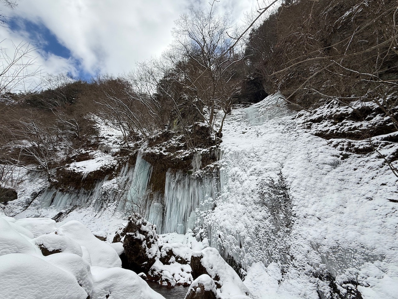 激しく流れる水の音が豪快な滝で、両サイド、滝の裏側にびっしりと氷瀑が出来上がっています。