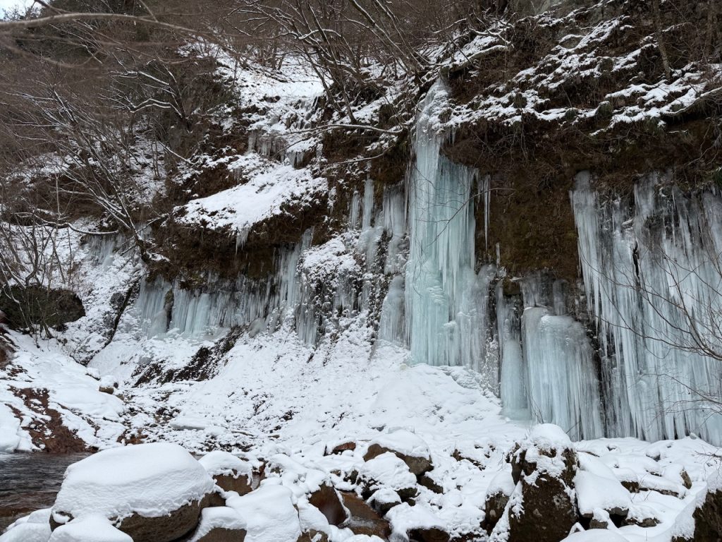 屏風岩と言う場所みたいですが、岸壁に大量の氷柱が折り重なって氷瀑が作られています。
