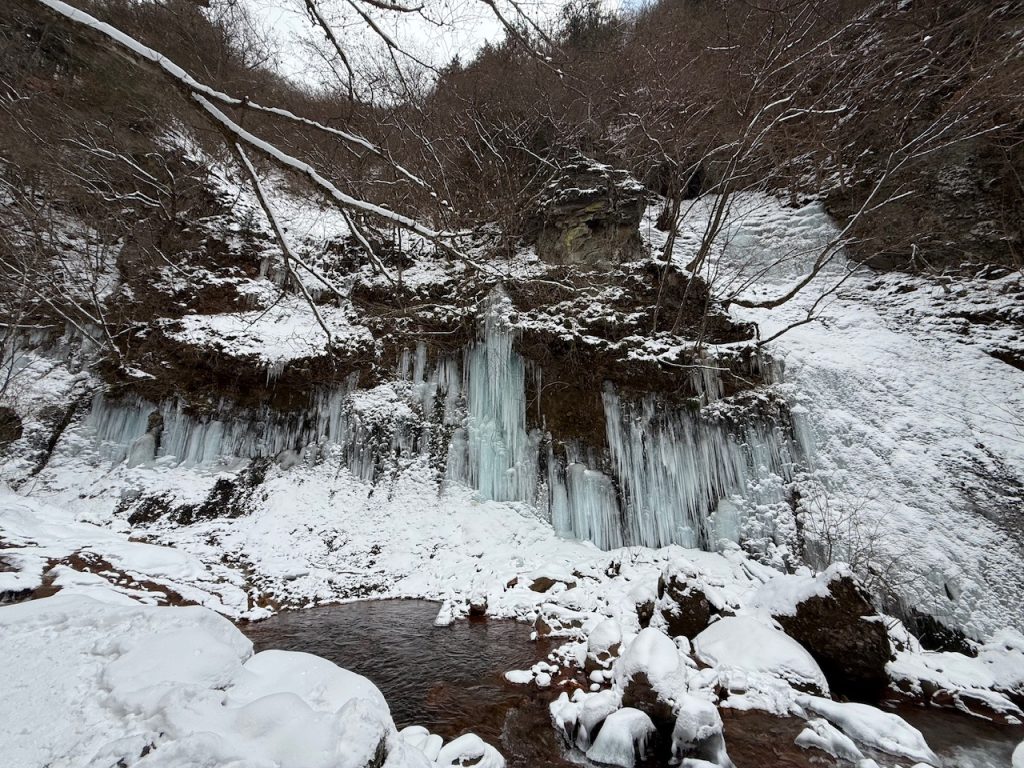 落差は約5mほどの滝ですが、川幅が広く水量がある滝の一部分に綺麗なブルーの氷瀑ができていました。