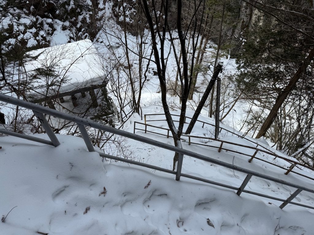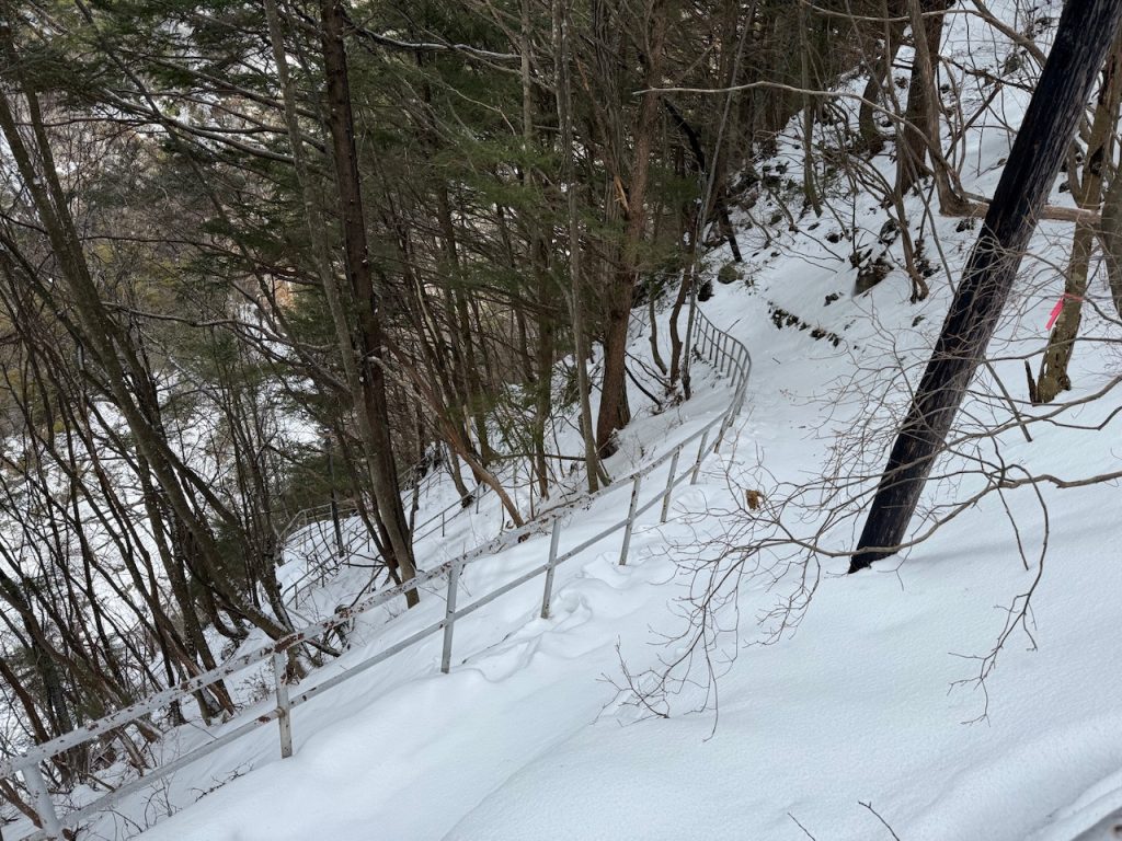手すりがあるので掴まって降りることができますので、少し安心感がありますが、急な下りの雪道は滑りましたので慎重にゆっくりと降りていきます。