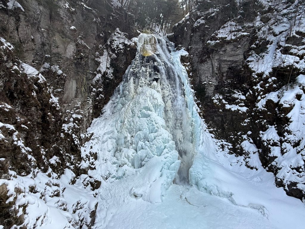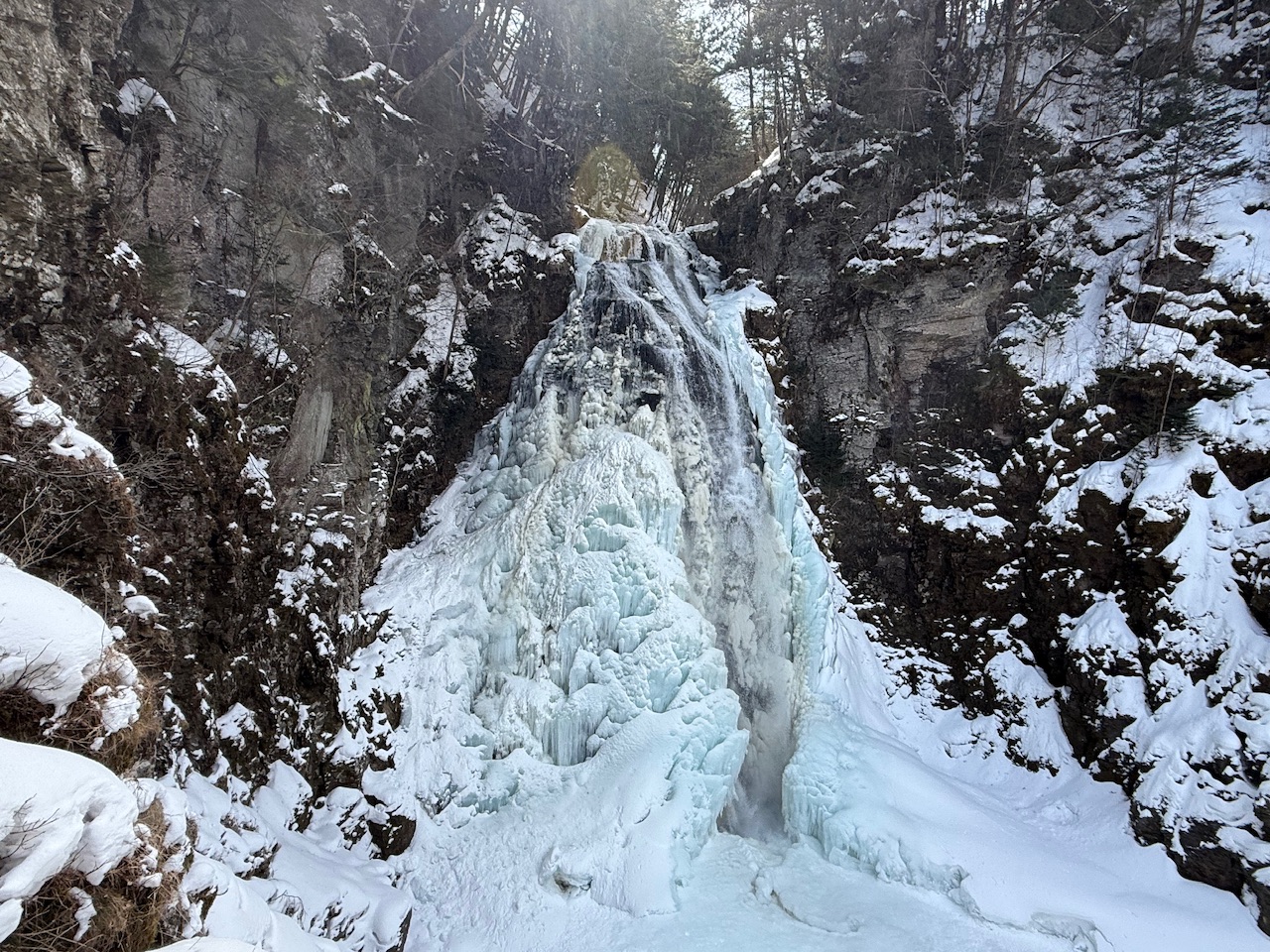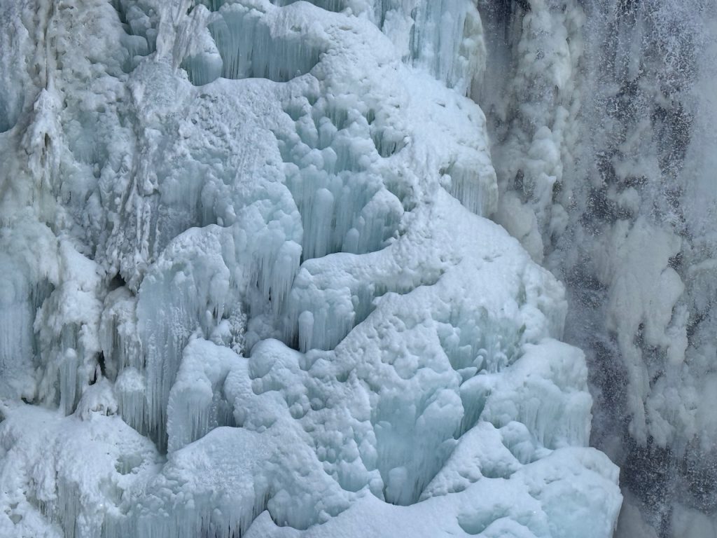 全氷結はしてなく、中央部分は水が流れていましたが、水量が多く荒々しい絶壁から豪快に水しぶきを上げながら流れ落ちている姿は迫力がありました。