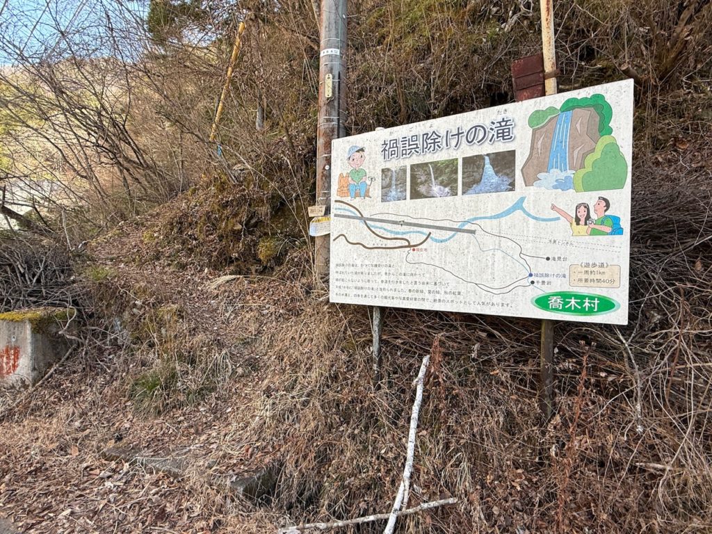 三遠南信自動車道の喬木インターの入口から山側に少し進んだ道路がカーブする場所に滝の看板がありました。