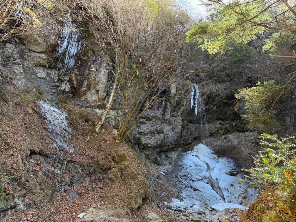 氷瀑は溶けてしまってますが、滝壺の表面部分は氷結がまだ残ってます。