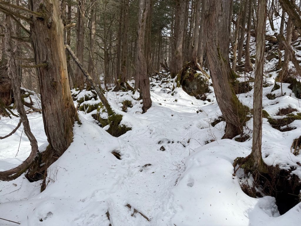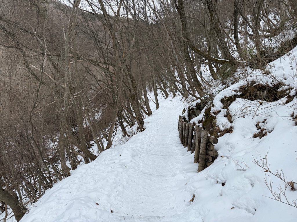 雪が凍って固くなっており、滑る箇所が多々ありましたので冬季に訪問する場合は注意が必要です。