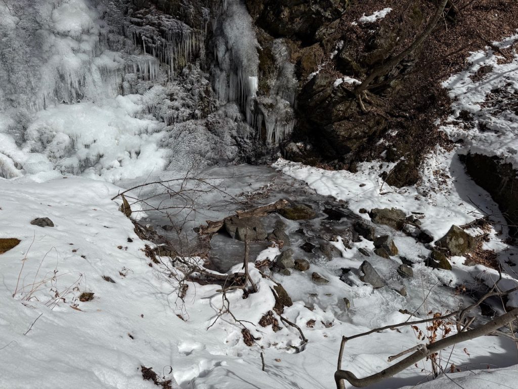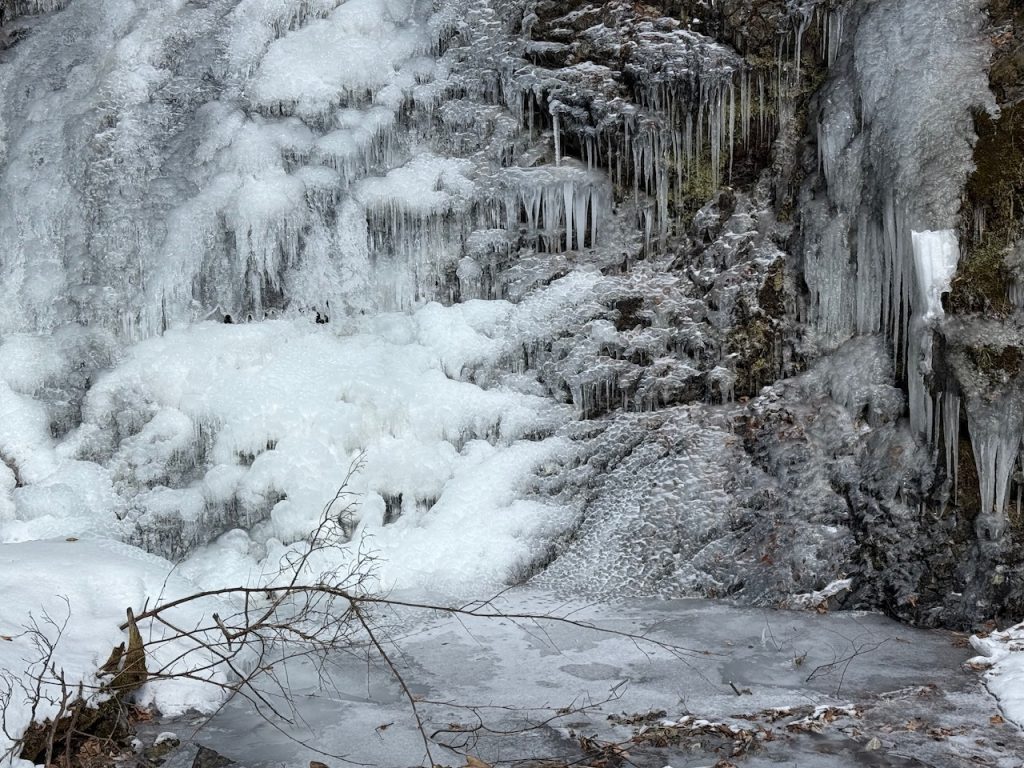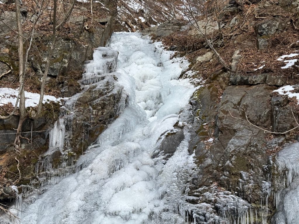 それほど大きな滝ではありませんが、滝つぼまで末広がりに形成された白く輝く氷瀑が綺麗です。
