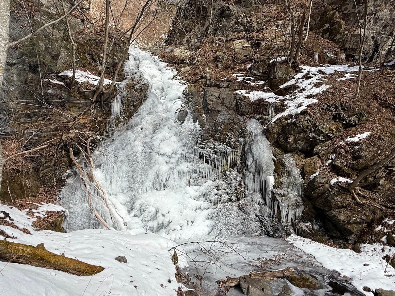 それほど大きな滝ではありませんが、滝つぼまで末広がりに形成された白く輝く氷瀑が綺麗です。