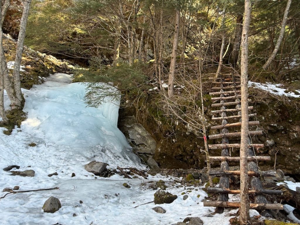 梯子の隣に一の滝が凍りついていました。