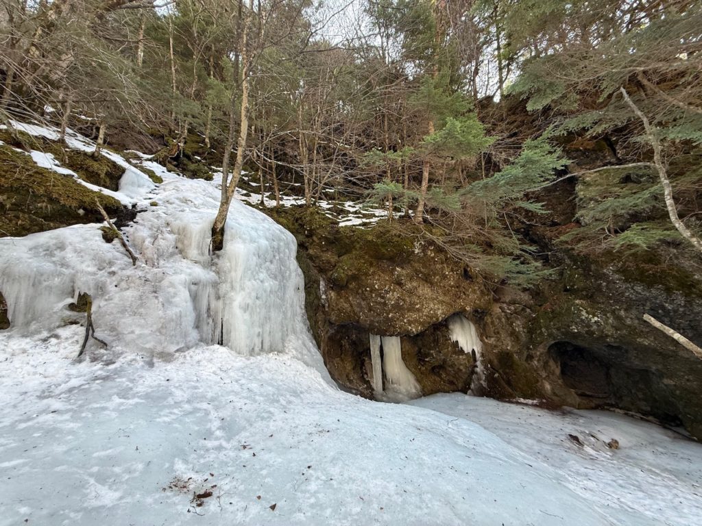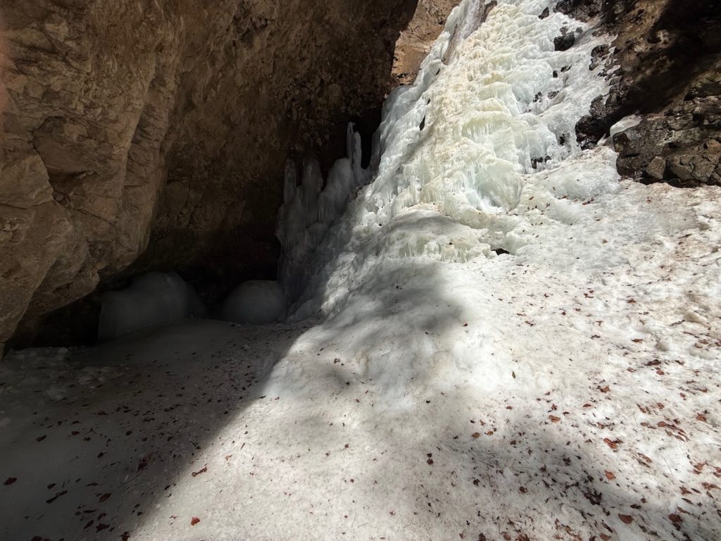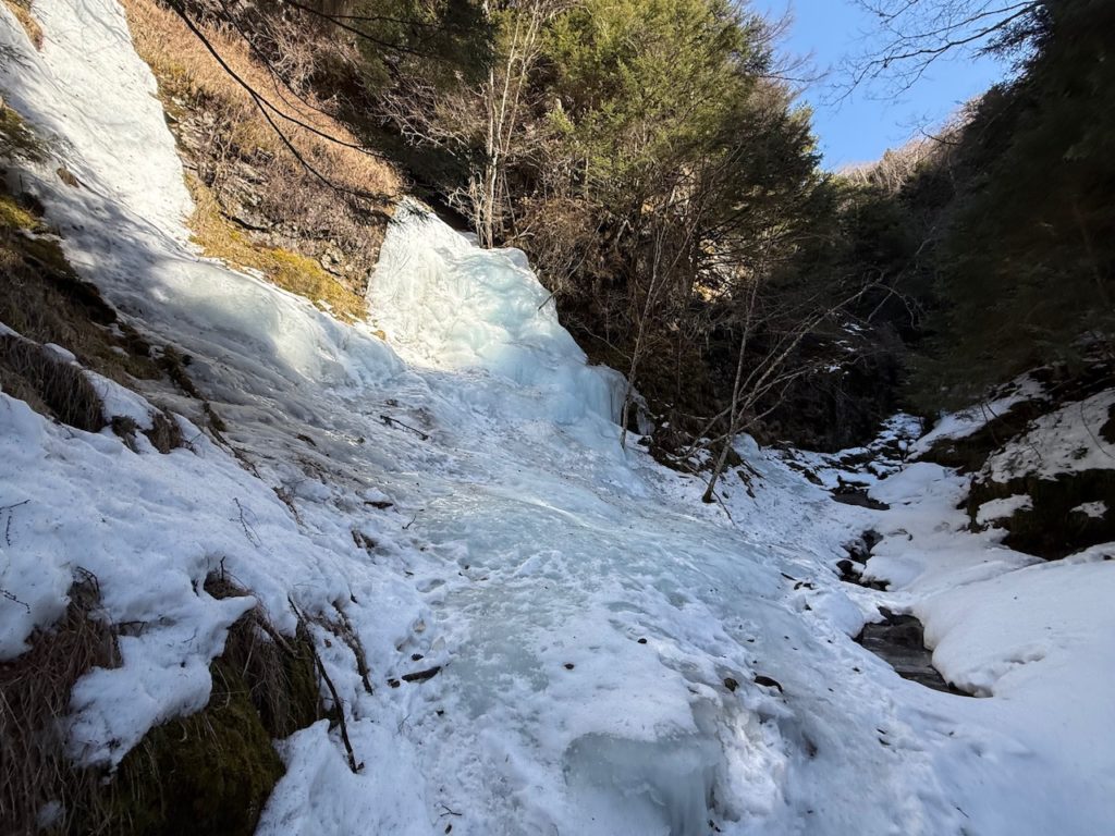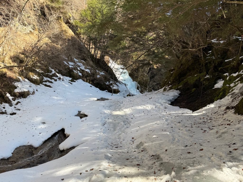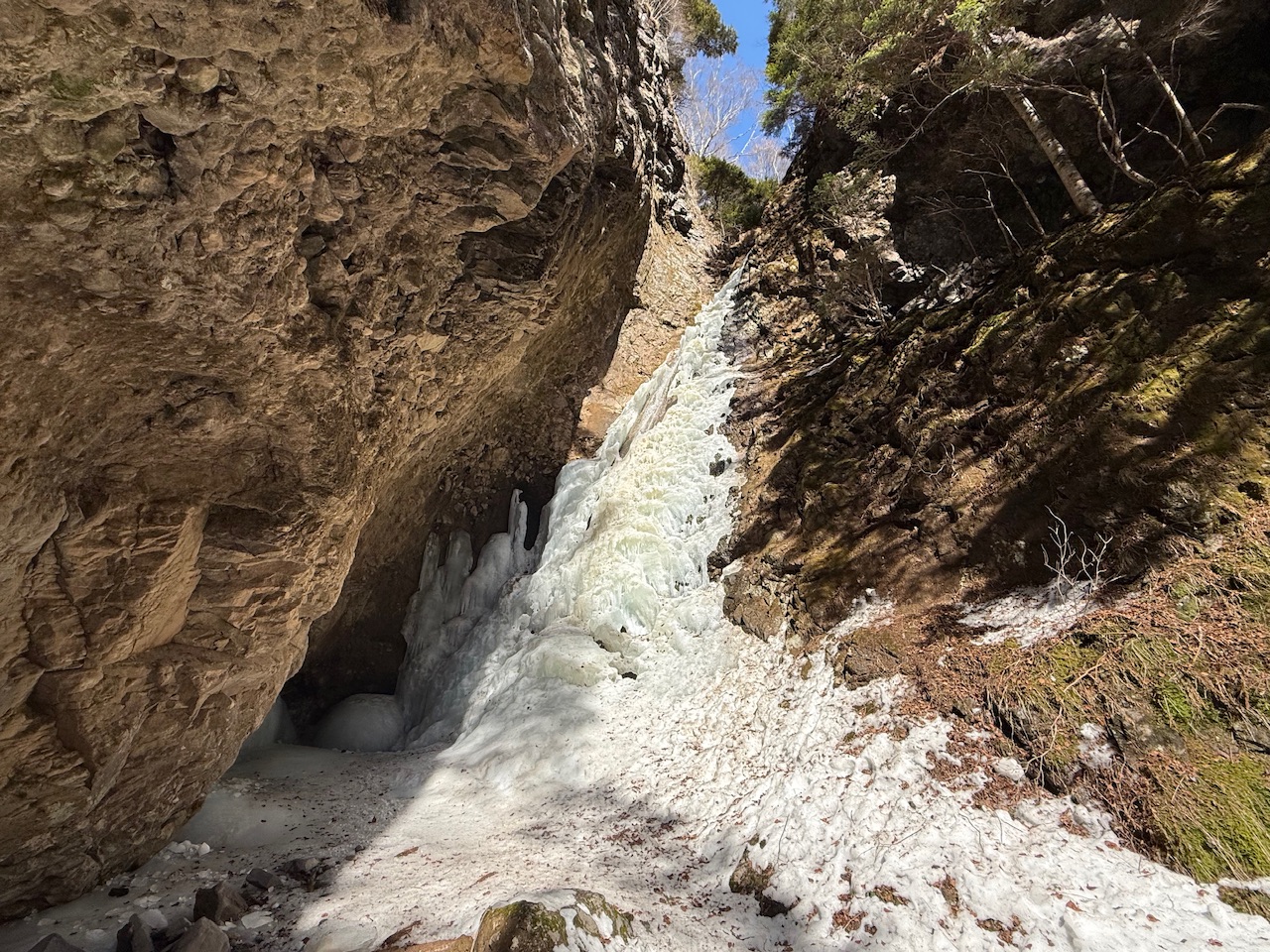 削られた岩壁の間に氷瀑がこんもりと形成されています。