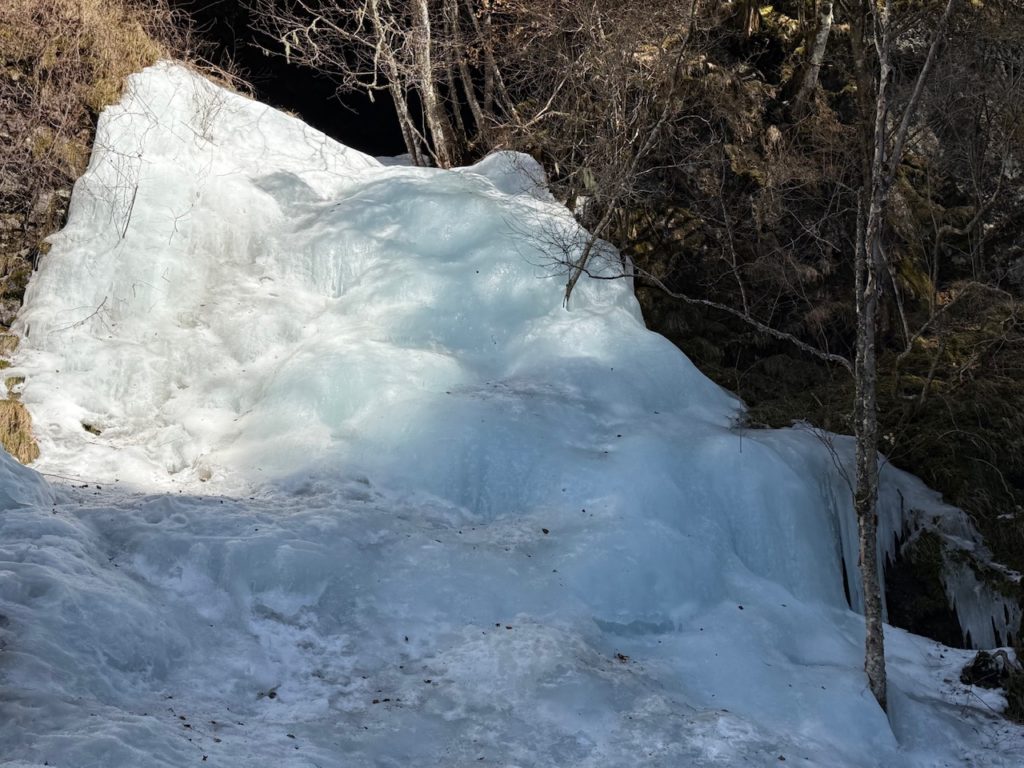 大きく成長したブルーの滝は素敵ですが、アイスクライミングをする人が多いので、氷瀑が茶色に汚れてしまっているのは少し残念です。