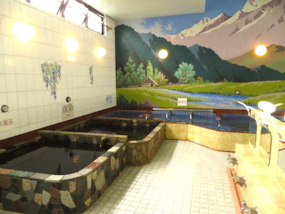 内風呂は横長の浴槽には椅子湯が3人分、ジェットバス、気泡風呂、低周波の電気風呂、寝風呂がありました。