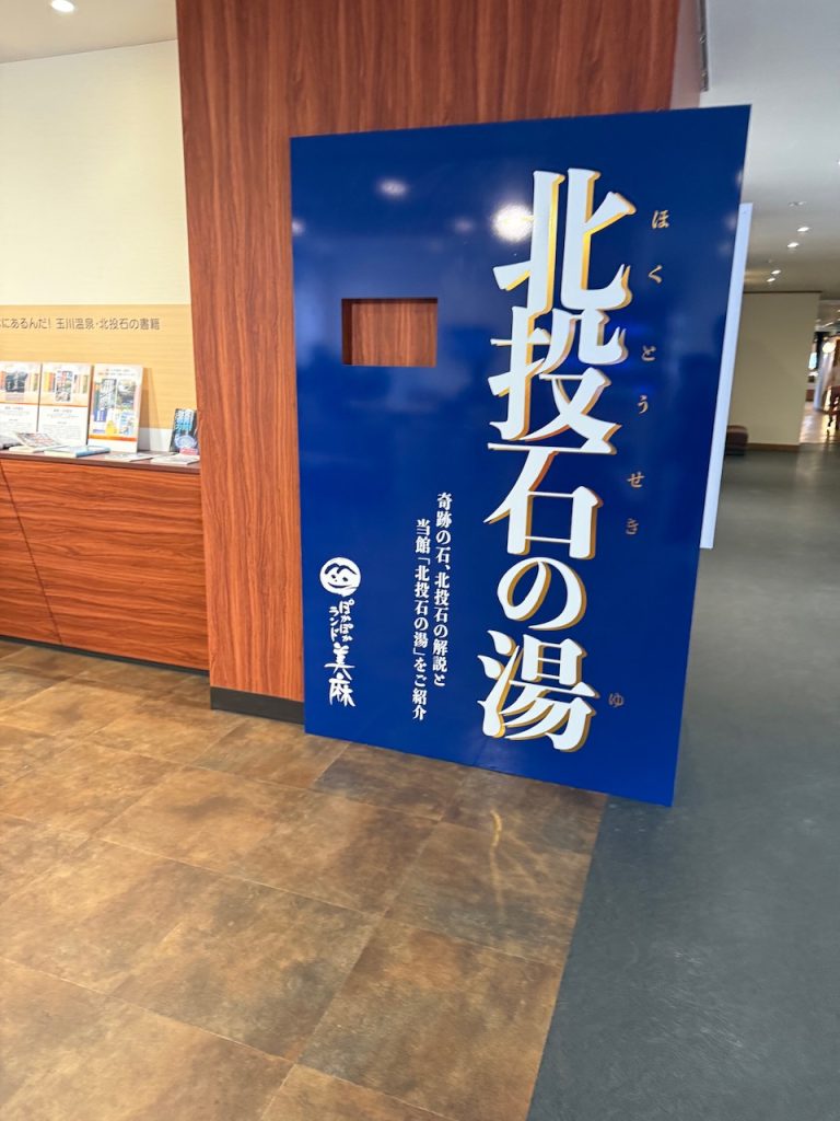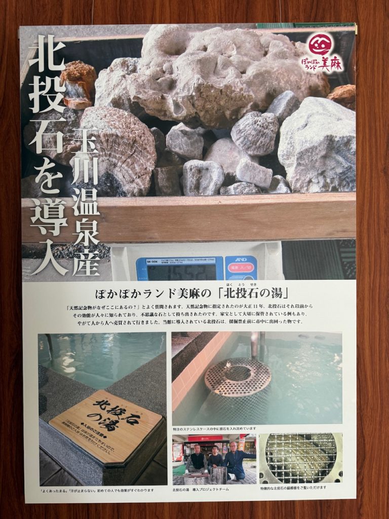 自慢の北投石の湯についての掲示がされており、玉川温泉から取り寄せた石と記載されていました。