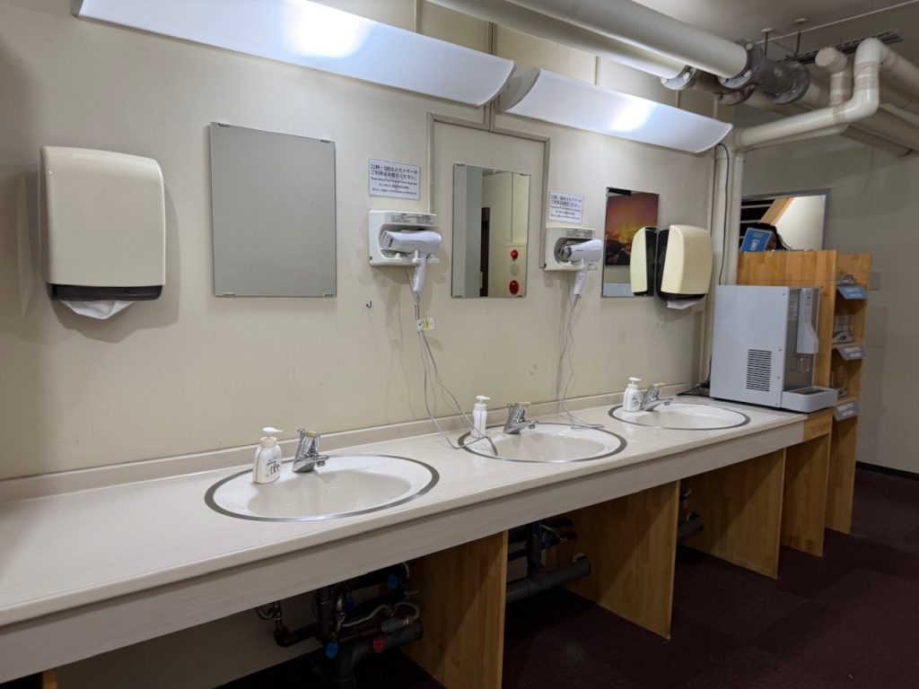 脱衣所前に男女共用の洗面台が3つ、ドライヤーは2つあります。