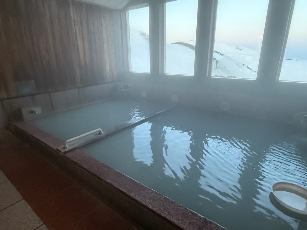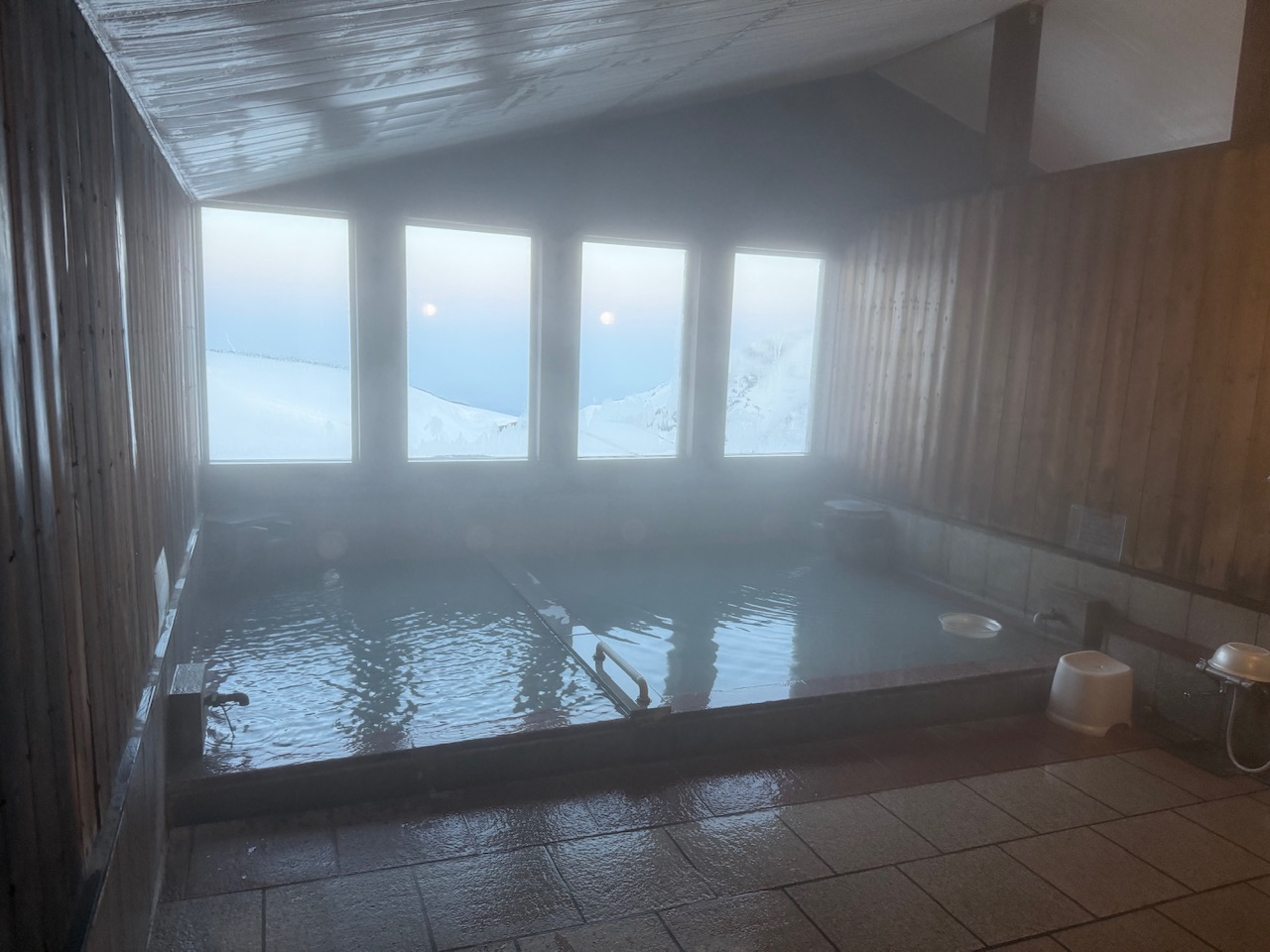 内風呂は窓側に横長の浴槽は仕切りられて分かれており、ぬる湯の浴槽は2人位の大きさ、熱湯は4人位の大きさです。