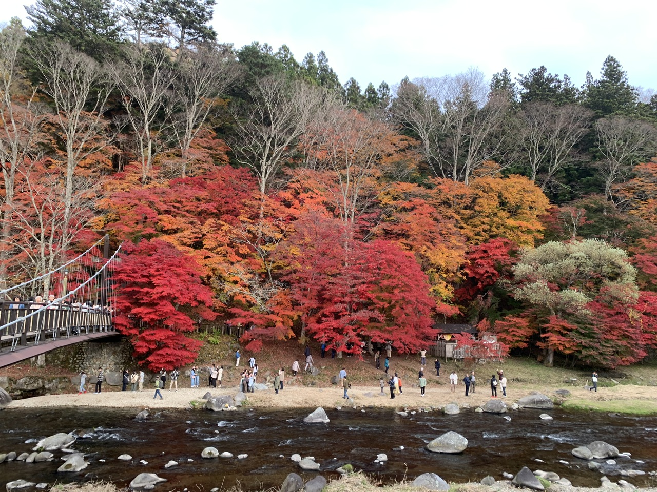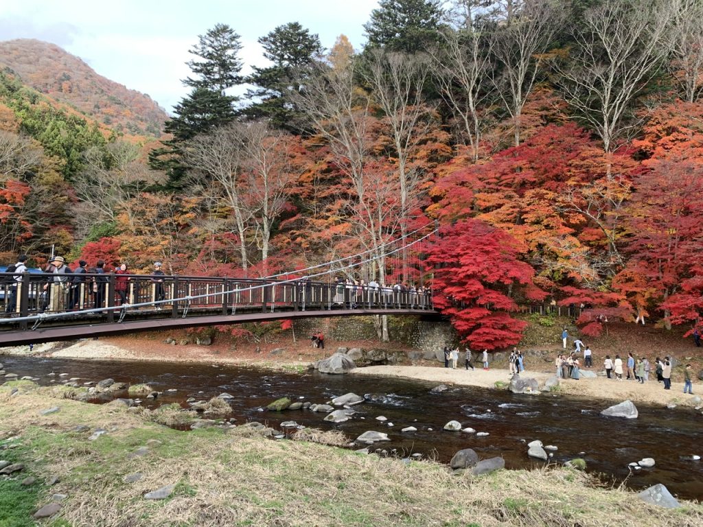 塩原もの語り館に車を駐車して川沿いのテラスに行くと紅葉の時期と言うこともあり、沢山の人が紅葉を楽しんでいました。
