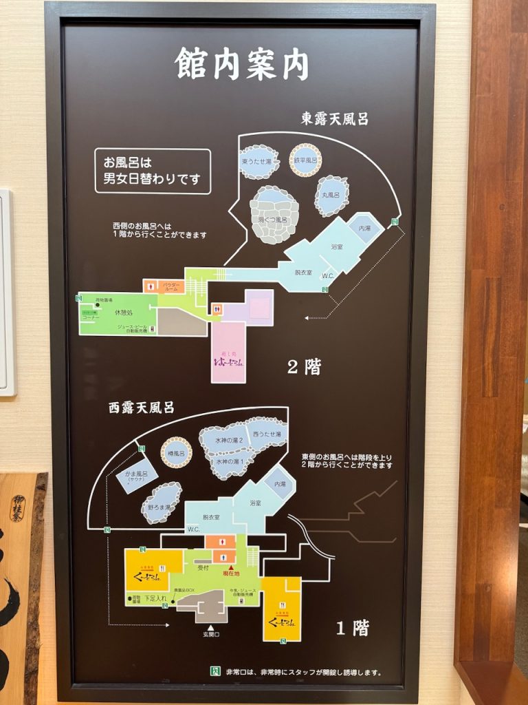 日替わりで西側1Fの浴室と東側2Fの浴室が男湯・女湯で入れ替わりでます。