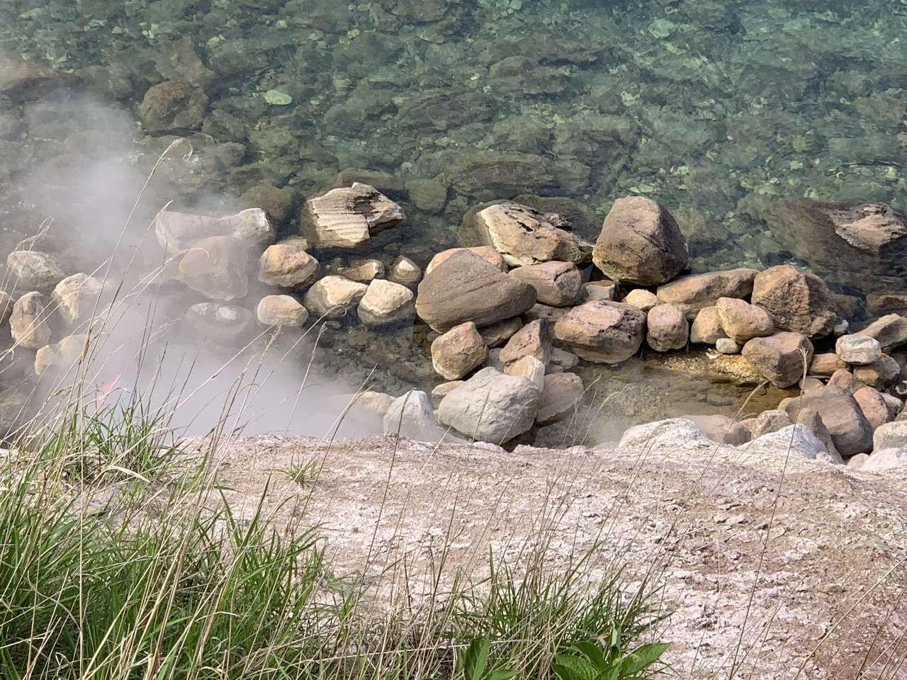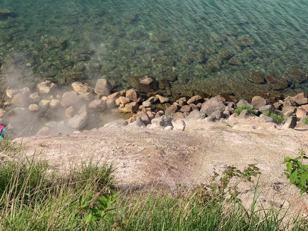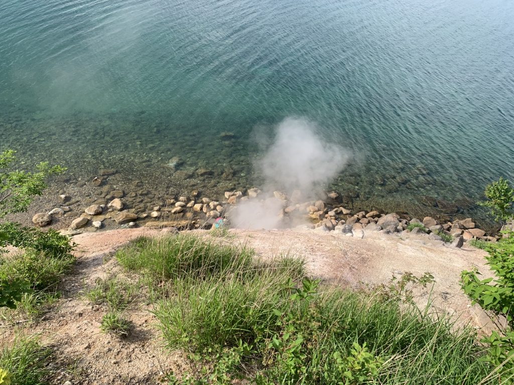 展望台から湖岸を見下ろすと、もくもくと噴煙が上がっていますが、遠目に岩で作られた浴槽が見えましたが、降りる道はなく急斜面は立ち入り禁止のロープが張られていました。