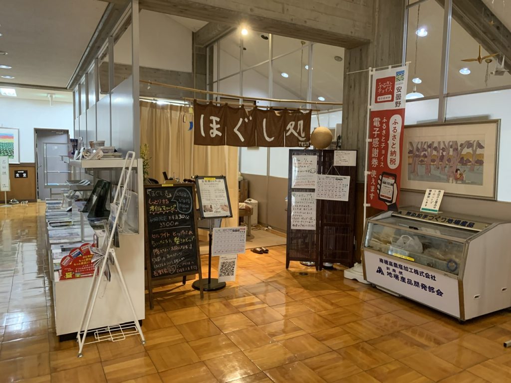 館内に入って受付をして、ロビーは簡素な雰囲気ですがマッサージやお土産などが並んでいました。