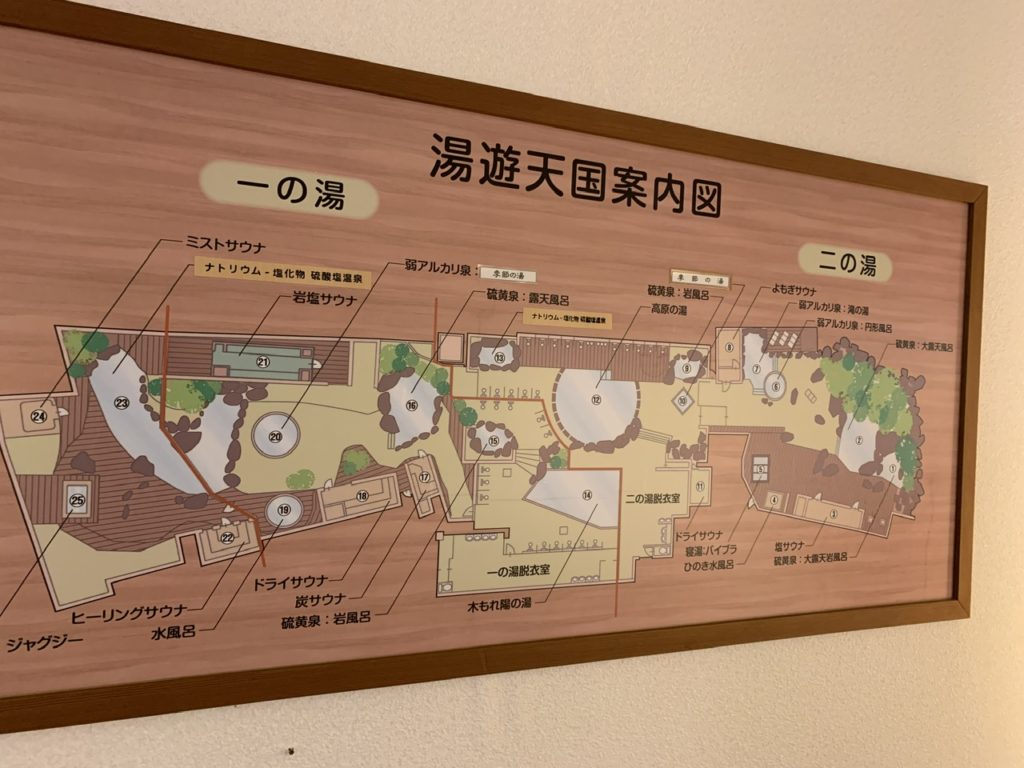 脱衣所にはお風呂の見取り図もあり、沢山の湯を楽しめそうでワクワクしますね。