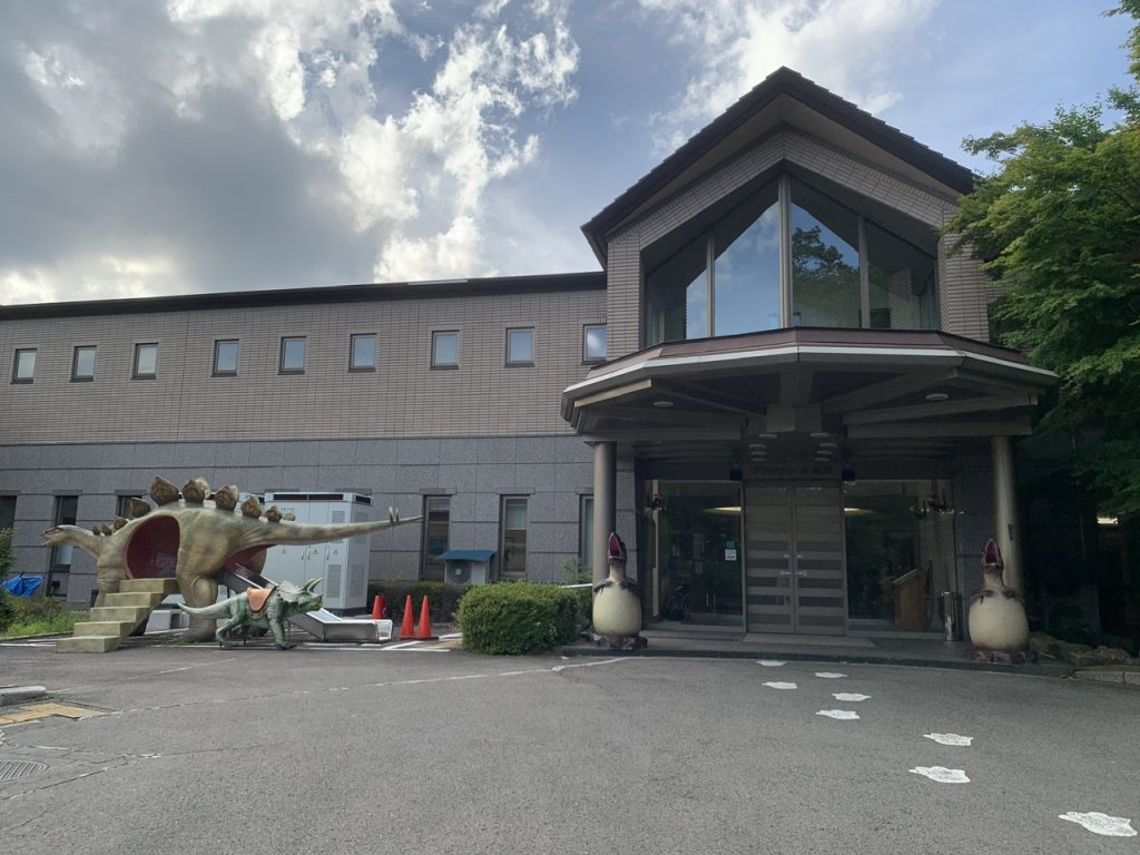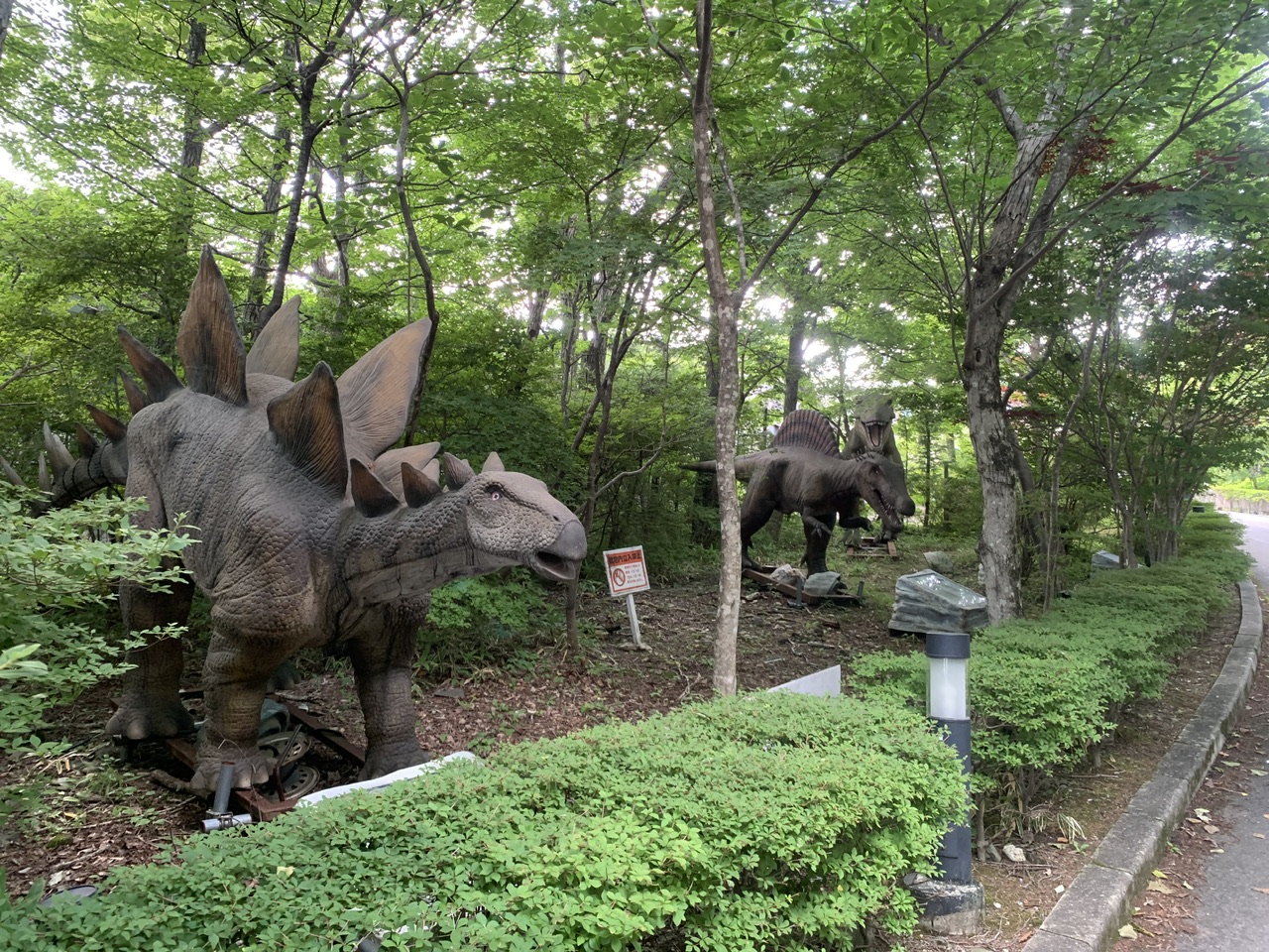 駐車場からホテルの入口までの道に恐竜のオブジェが点在しており、恐竜がお出迎えしてくれます。