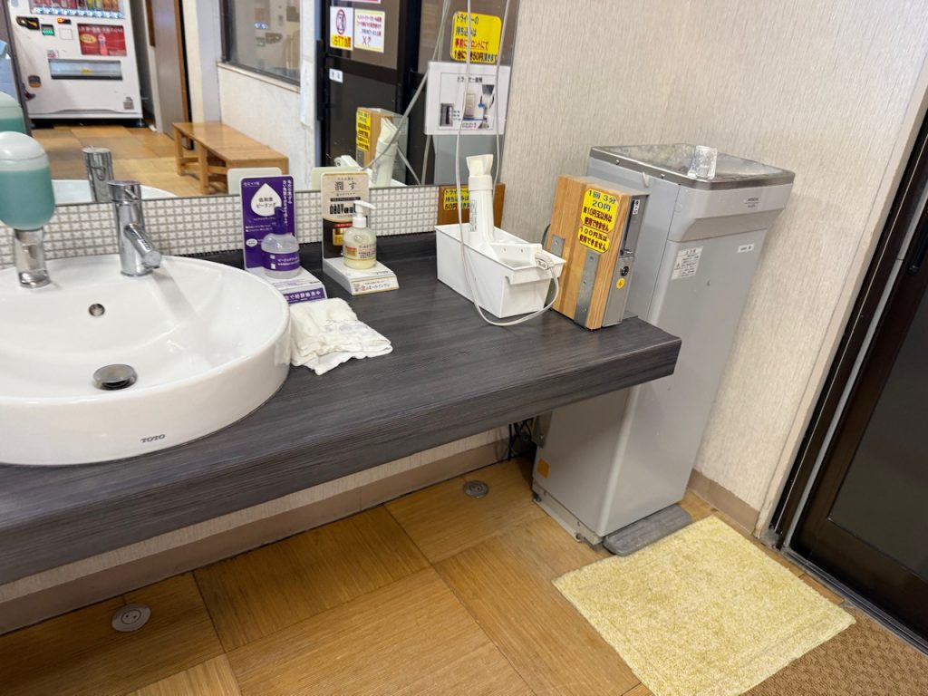 洗面台は1つ、無料のドライヤーは無く、有料ドライヤーは3分20円、ドライヤーの持ち込みは1台50円でした。