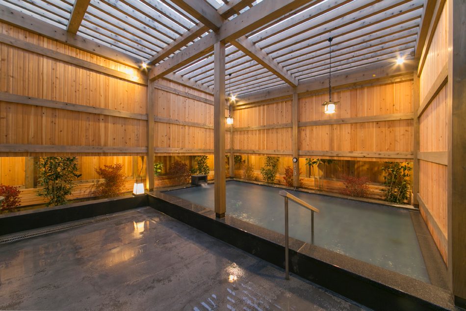 敷地内から湧出する自家源泉を全ての浴槽にかけ流ししている湯は、微白濁、日によりエメラルドグリーンに輝く硫黄成分を含む温泉です。