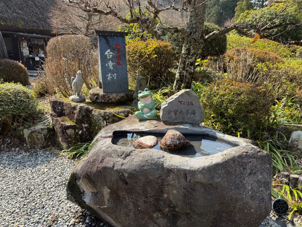 立派な石の作りの手湯の上にはカエルのオブジェがかわいいです。
