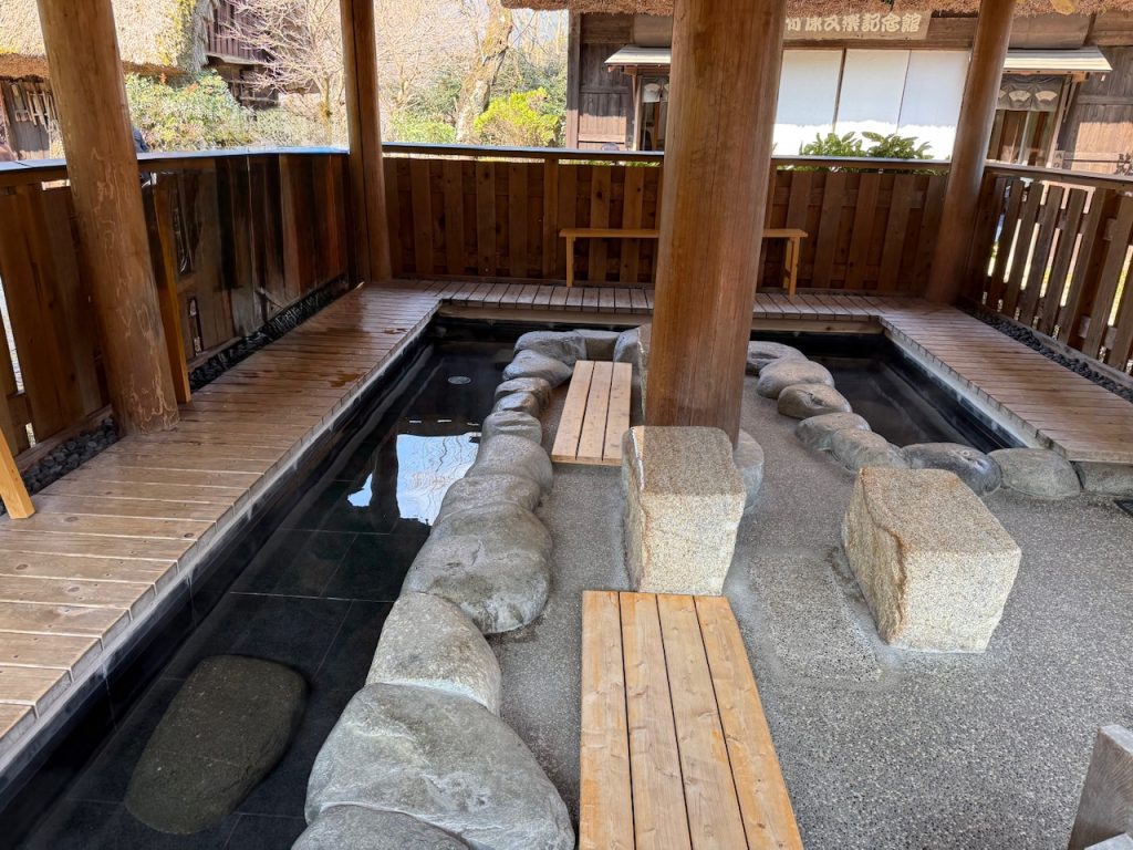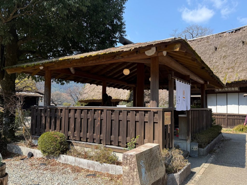 いろいろな家屋の展示物を巡っていくと、合掌造りの作り方に寄せて作った東屋に足湯がありました。