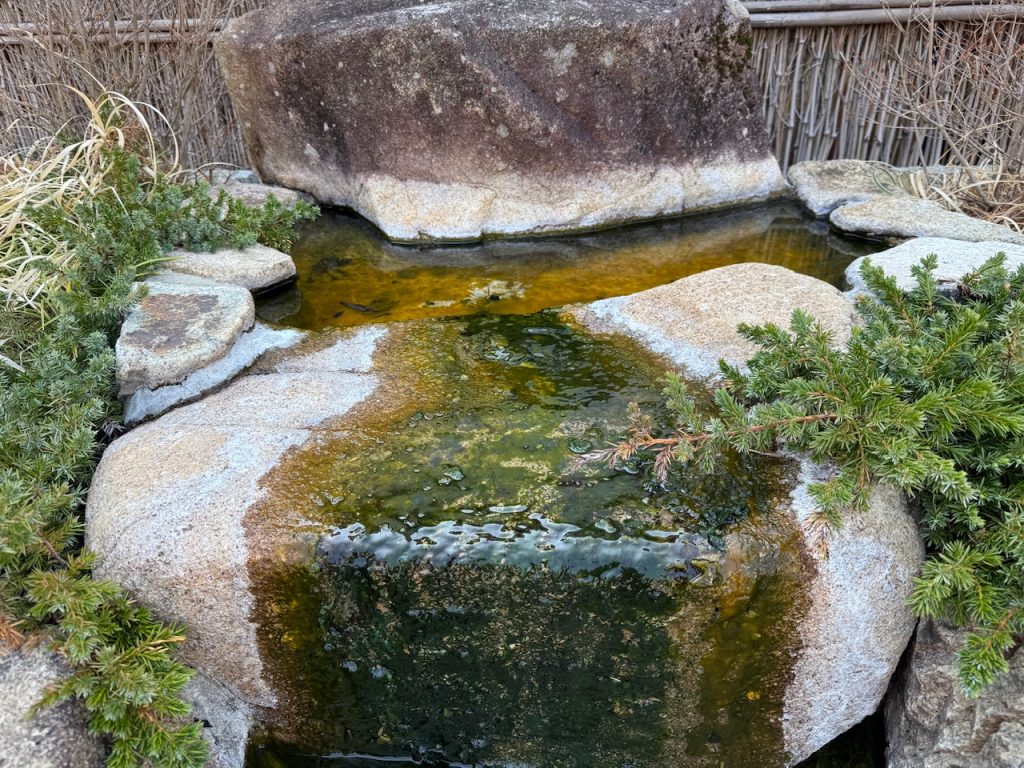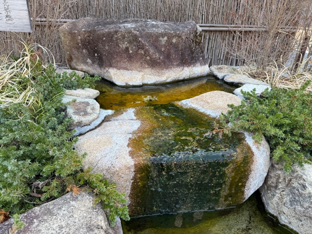 石に苔が付着していますが、温泉の温度は熱めでぬるっとよい湯です。