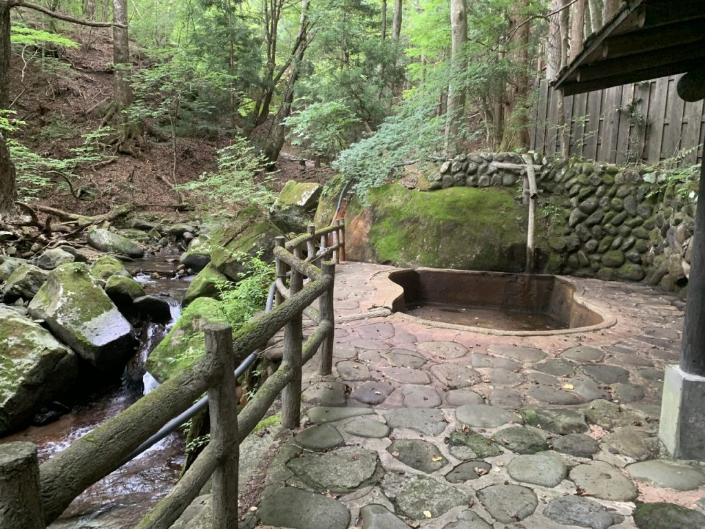 ひょうたん形の浴槽は趣きがあり、木々に囲まれてロケーションが最高な場所にありました。