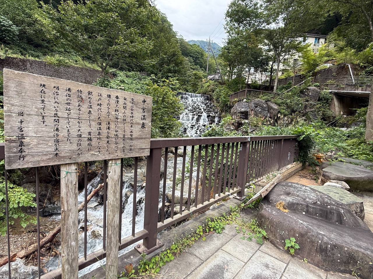 中宮温泉入口に大きな駐車場があるので、車を停めて温泉旅館の方へ河川沿いの坂道を登っていくと足湯がありました。