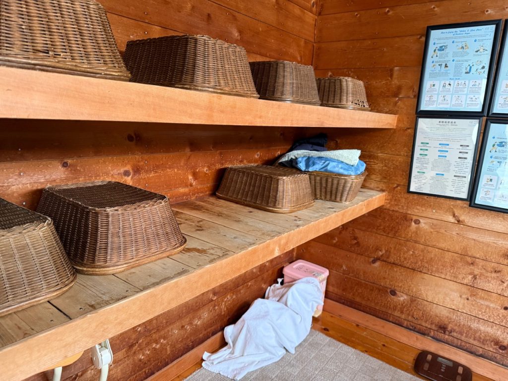 そんなに大きくない脱衣所ですが、木のぬくもり感じる作りで落ち着きます。