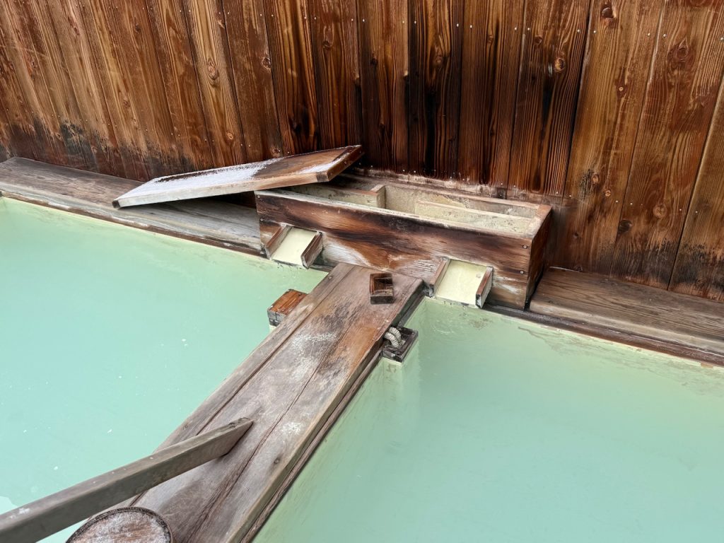 湯口から源泉がかけ流されていて、湯船には白い湯花も沢山浮いています。