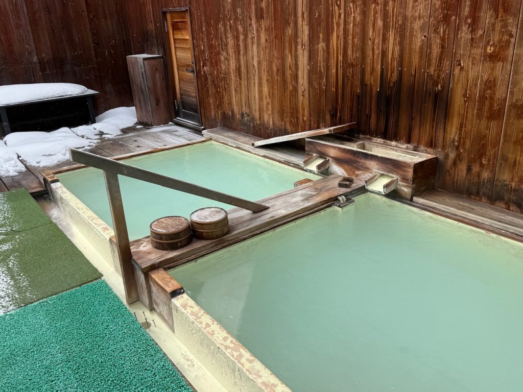 露天風呂も木の造りの浴槽となり、正方形の同じ大きさの浴槽が二つ並んでいました。