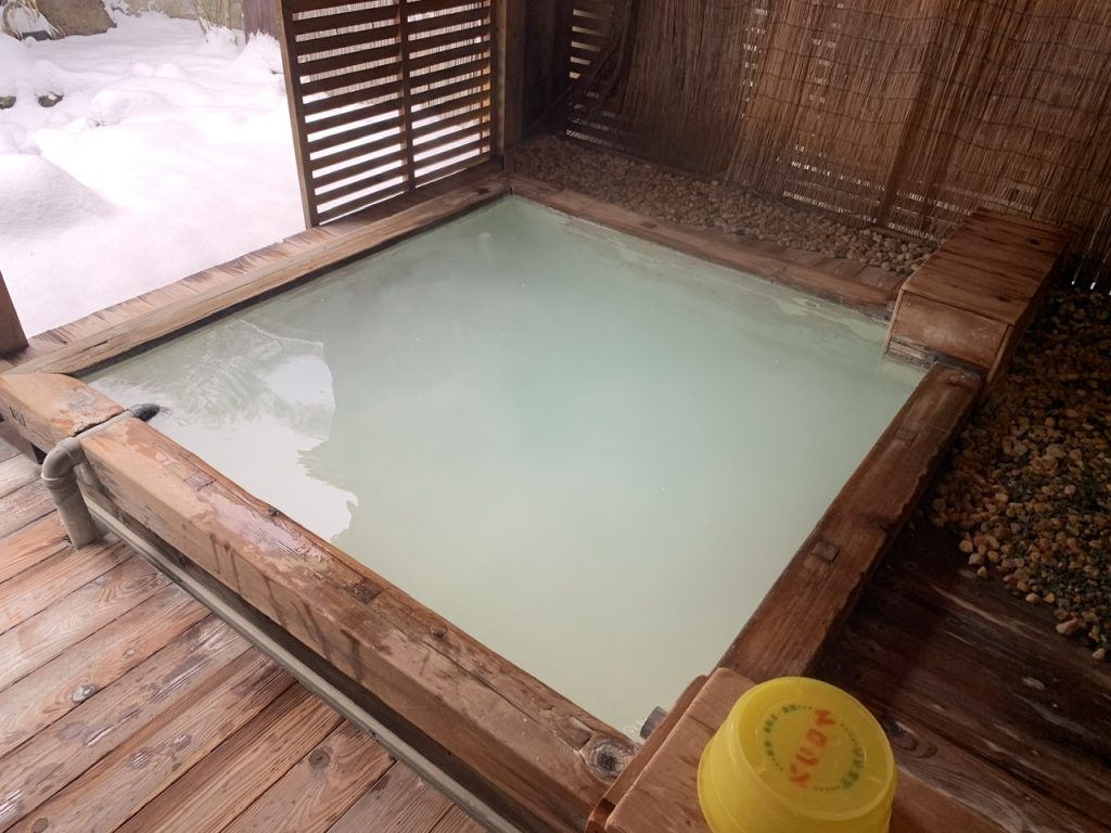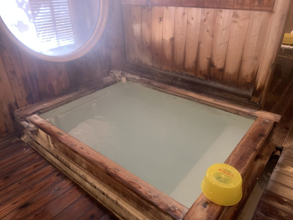 源泉を掛け流しで提供しており、お湯は白く濁ってしっとりとして新鮮でよい湯なのがわかります。