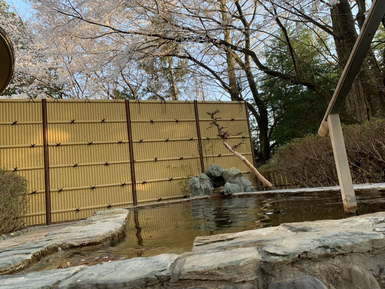 露天風呂の前の庭園は大きな桜の木が複数あり、空の青とピンクの桜を眺めながら温泉に入れる素敵な露天風呂です。