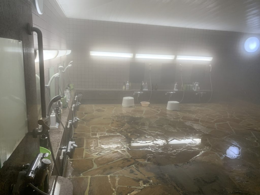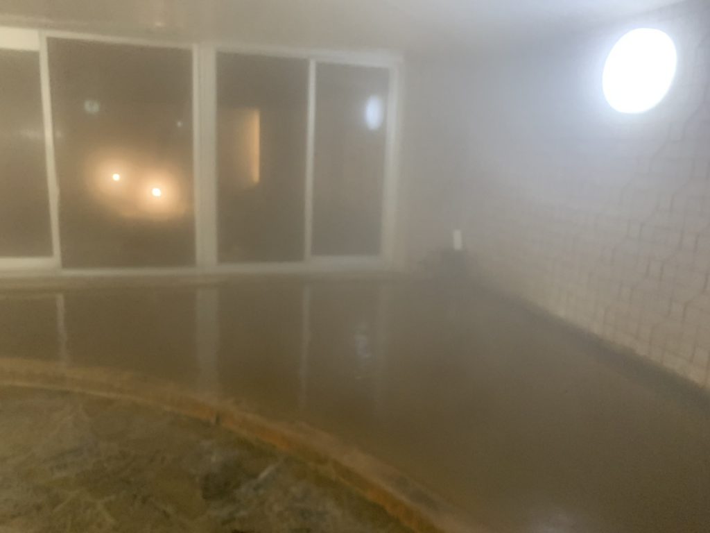 内風呂2つあり、8人程の浴槽は薄茶色のお湯で源泉かけ流しです。