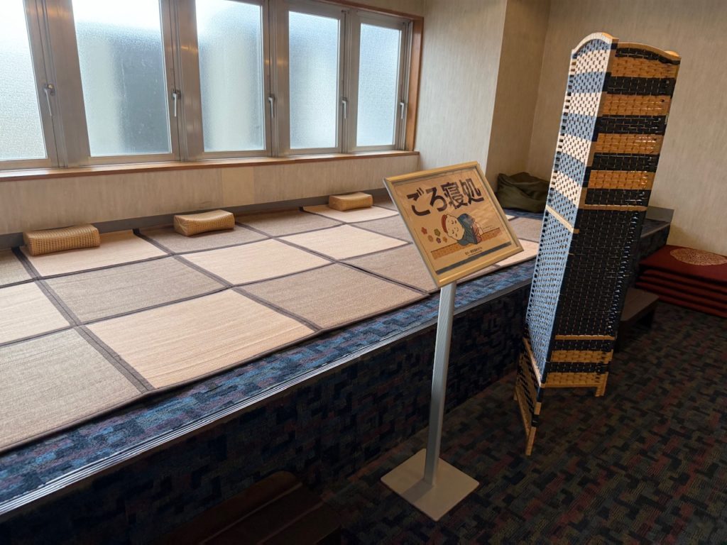 テレビがある広い休憩室や寝転んで休めるごろ寝処があります。