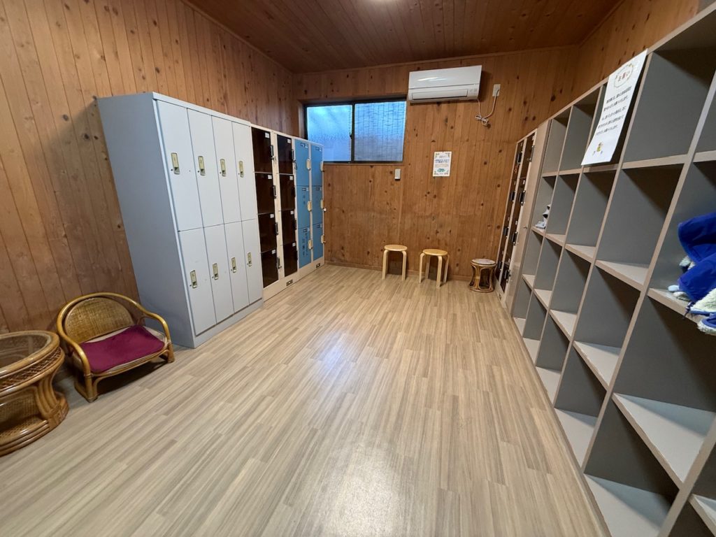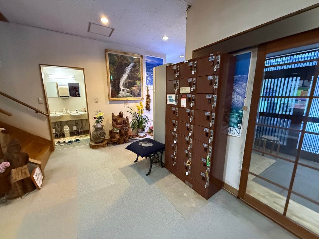 館内に入って行くとロビーに貴重品ロッカーがあり、休憩スペースに水飲み機があります。