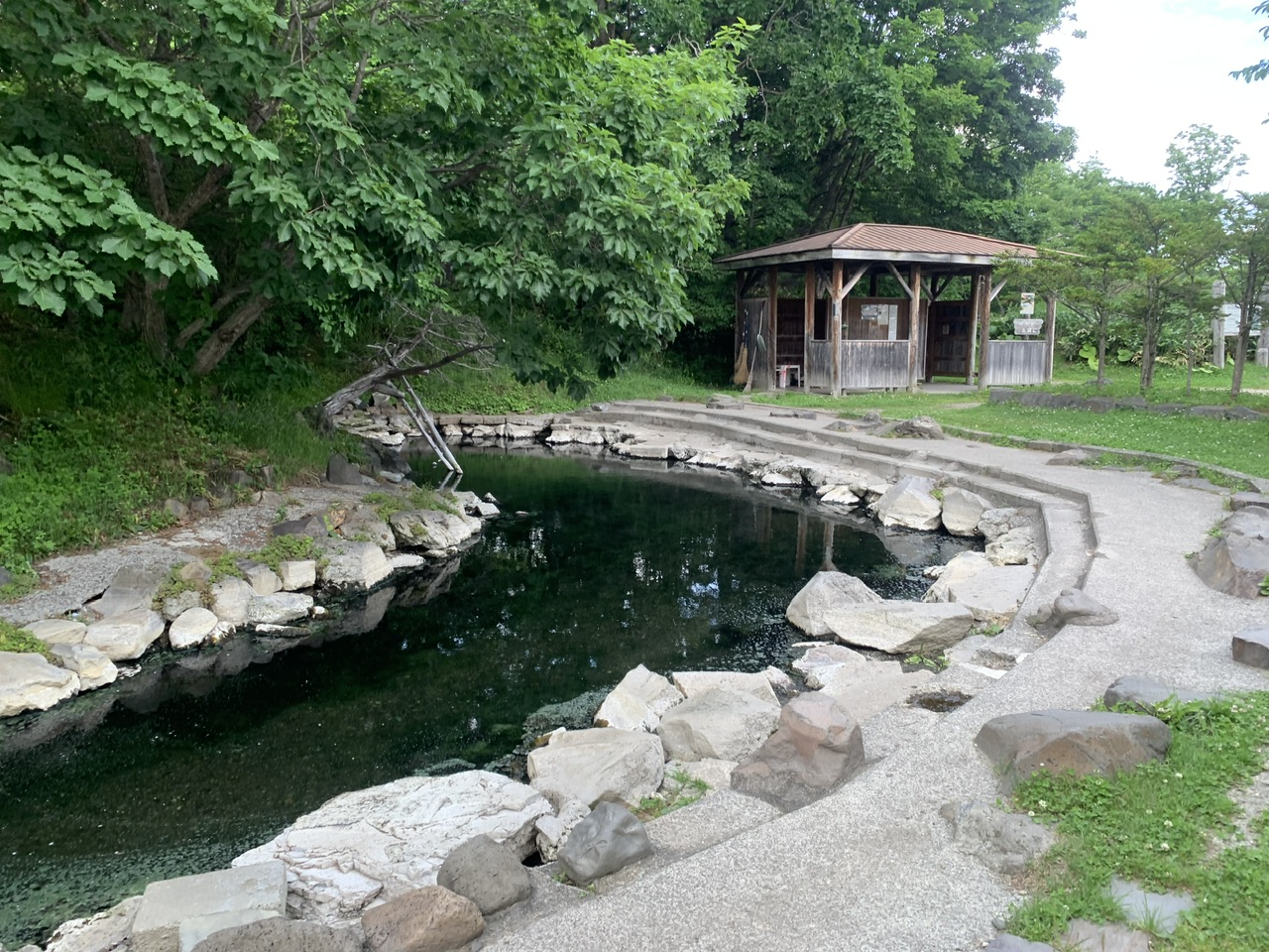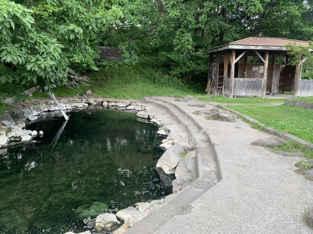 駐車場から湖を眺めながら歩いていくと広い広場の端に石造りの露天風呂がありました。