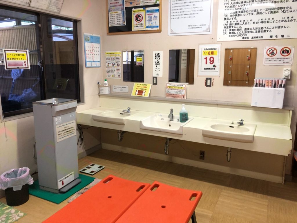 シャワーは無く、蛇口のお湯で桶にお湯を貯めて体を洗う方式となり、蛇口の湯は温泉です。
