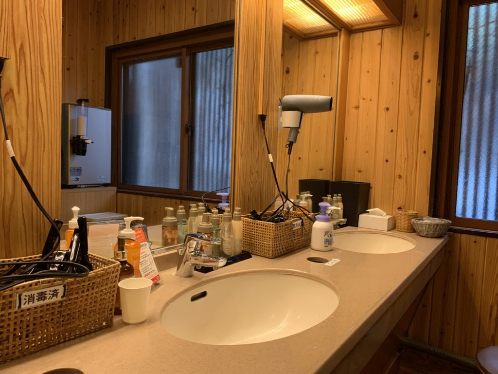 ローション、綿棒などのアメニティが充実していますが、温泉の大きさと比較すると洗面台の数は少な目に感じます。