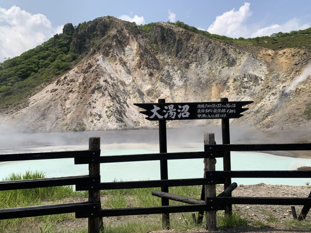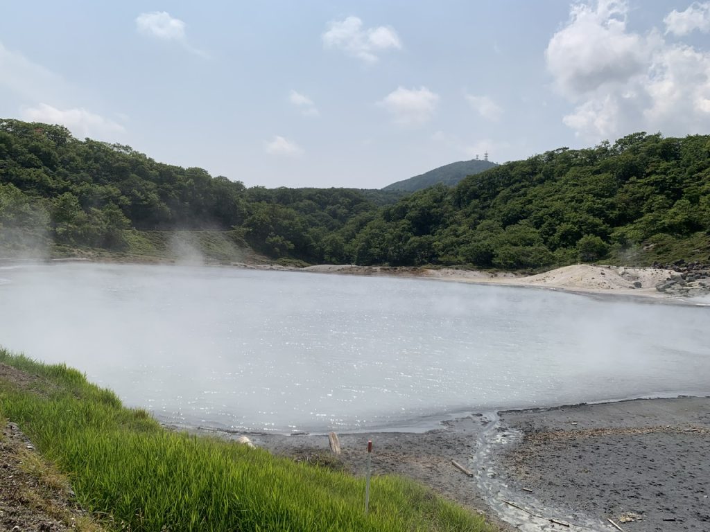 日和山の水蒸気爆発によって形成された爆裂火口跡に周囲1km、深さは22m、沼底からは約130℃という高温の硫黄泉が湧き出ている沼が大湯沼です。