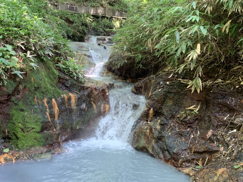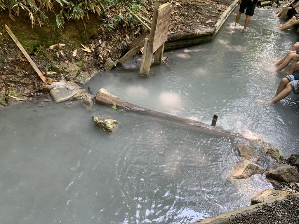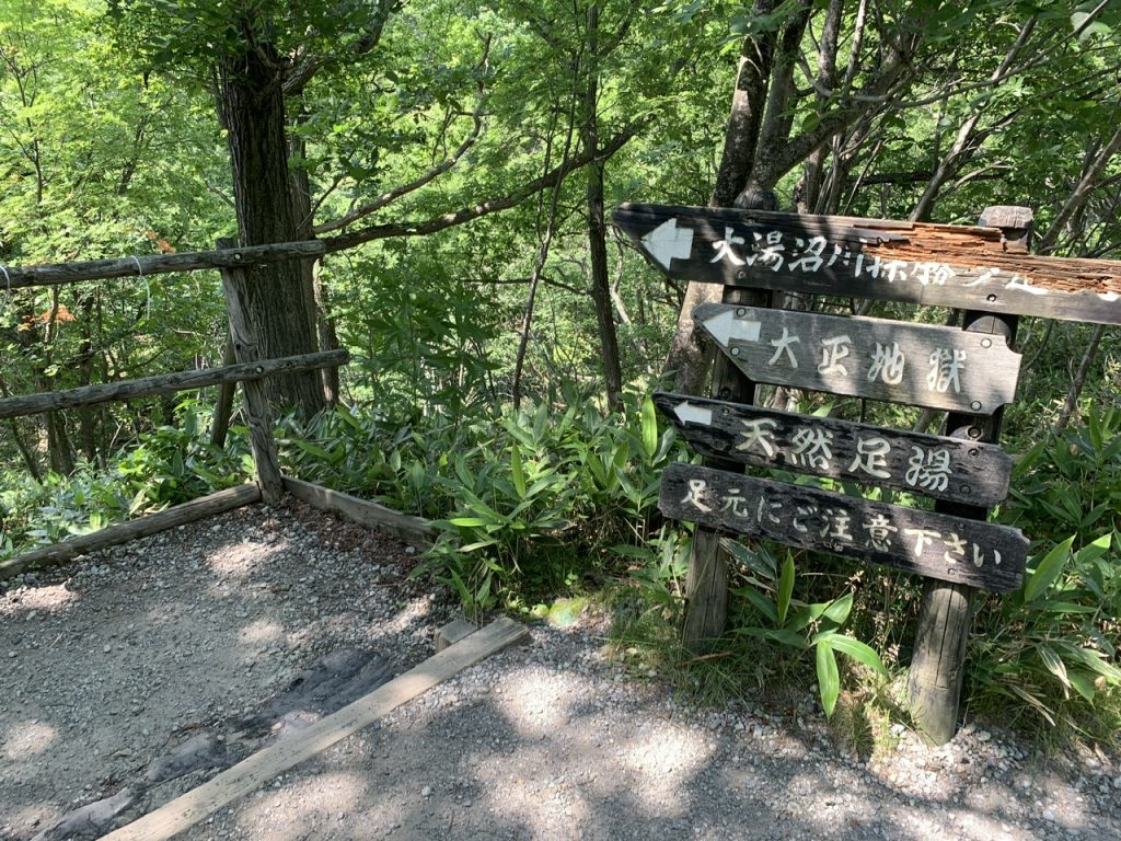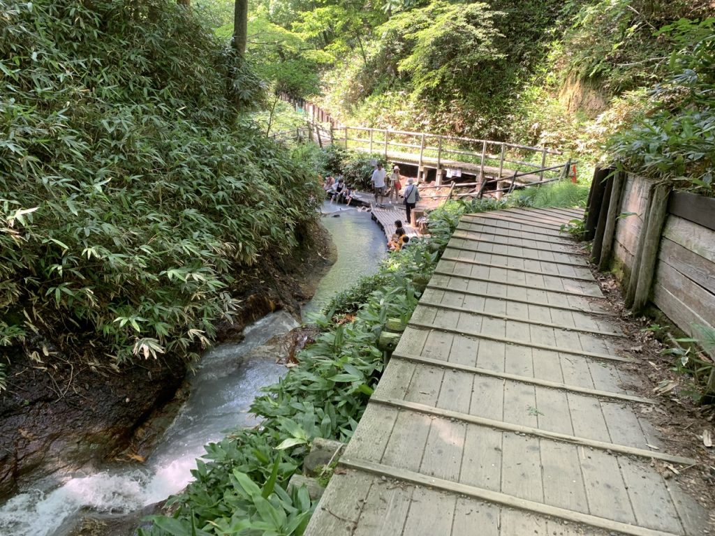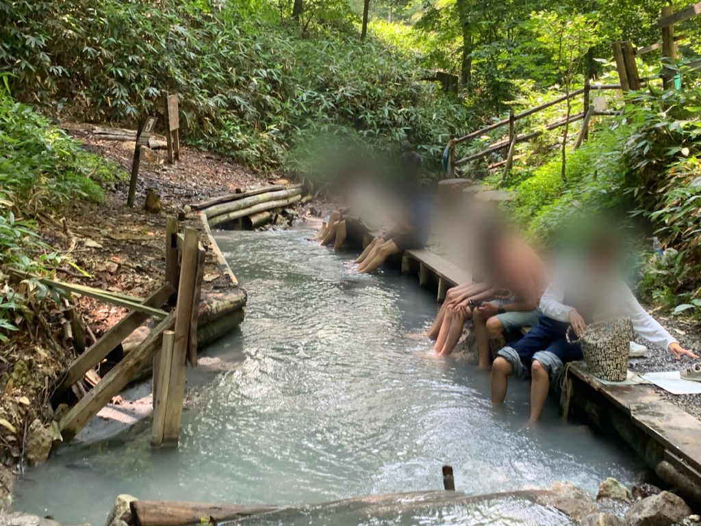 大湯沼から川となって流れていった先に足湯ができる場所があり、地獄谷から山を登った先にある駐車場から徒歩で15分ほどの場所にあります。