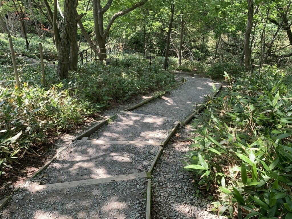 沼を半周した後は看板が設置されて足湯までは林道の坂道を下っていきます。