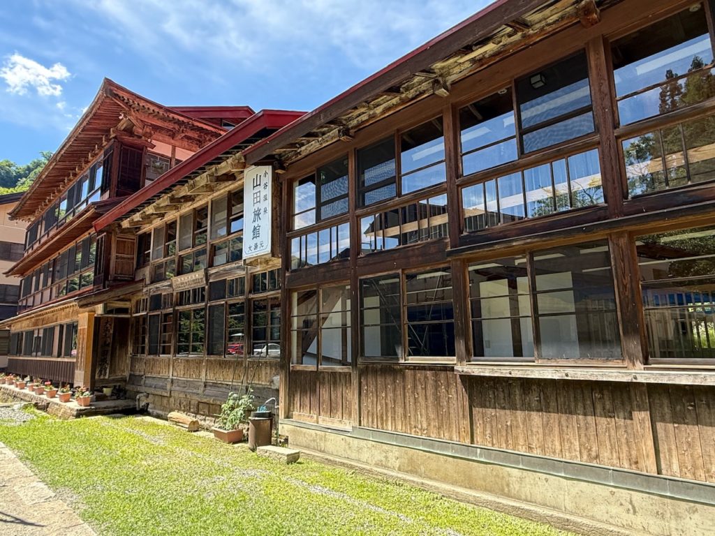 標高850mの山腹に建つ「山田旅館」は、江戸、明治、大正、平成とそれぞれの時代に建築された建物が軒を連ね、木造建築6棟が文化庁の登録有形文化財になっています。