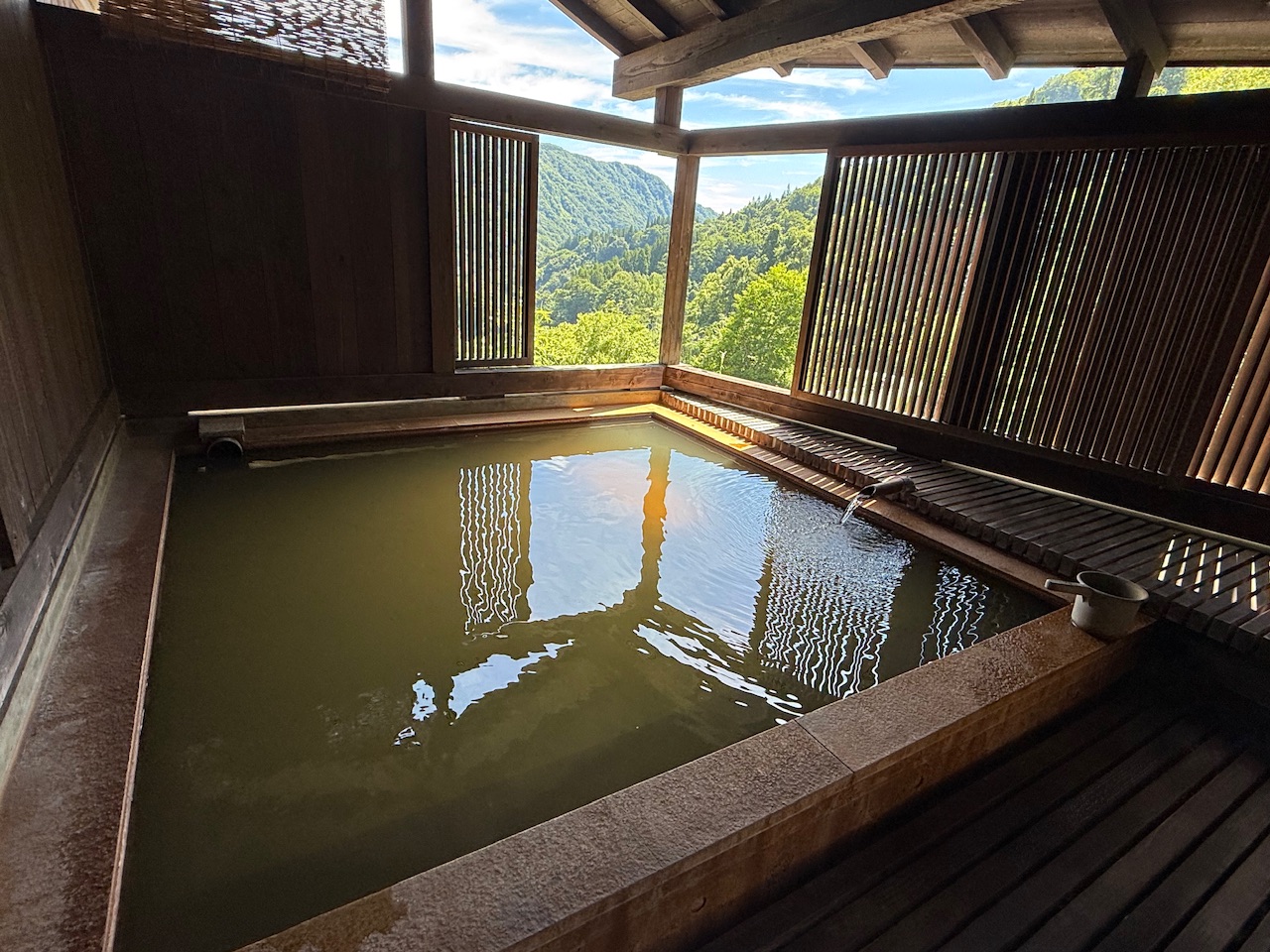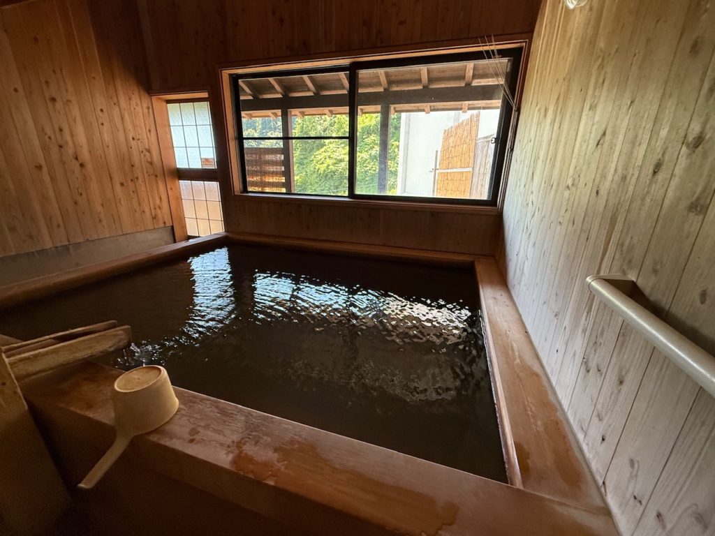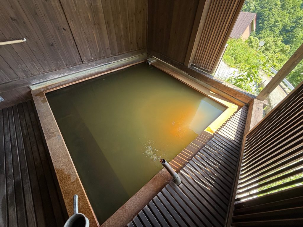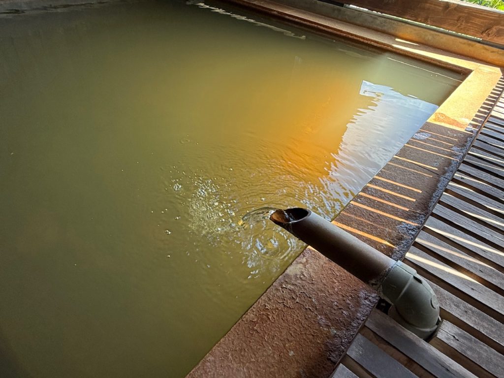 湯口から薄い茶色のお湯が掛け流されていて、肌触りがしっとりしていて、自然を感じながらの入浴はとても癒される時間になりました。