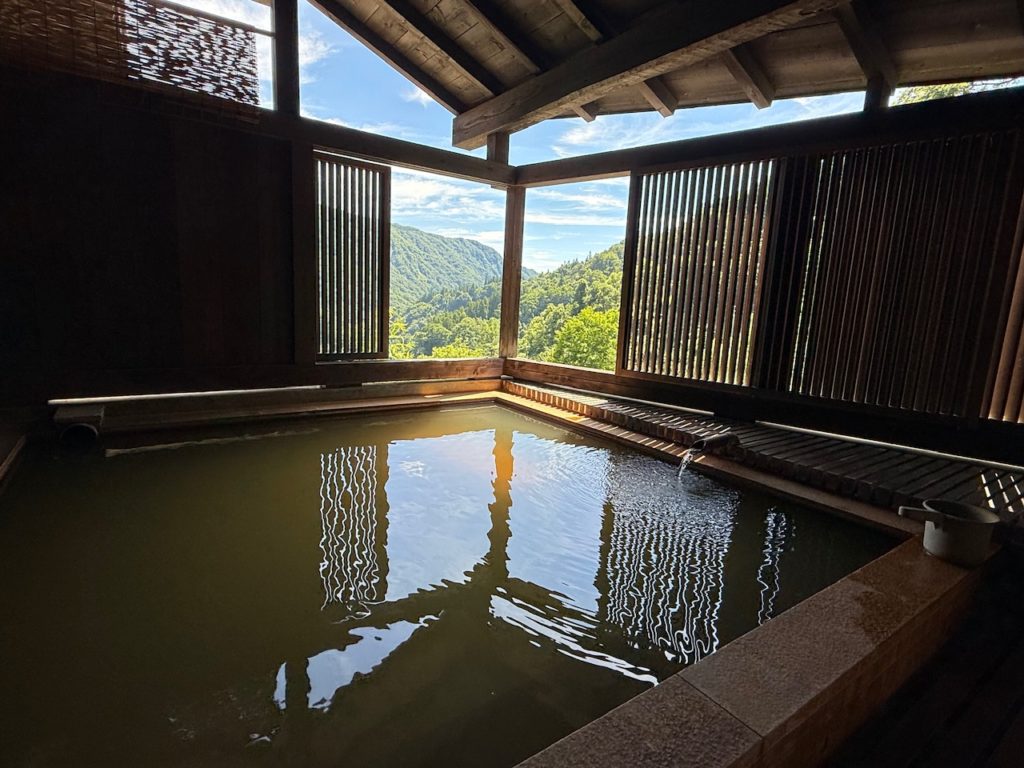 解放感はないですが、山々を見渡しながら入浴する事ができるので、木のぬくもりを感じる空間でしっぽりと良い温泉を味わうことができます。